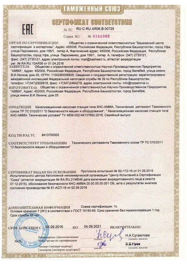 Наша компания является производителем канализационных насосных станций, качество КНС-АММА подтверждено сертификатом соответствия.